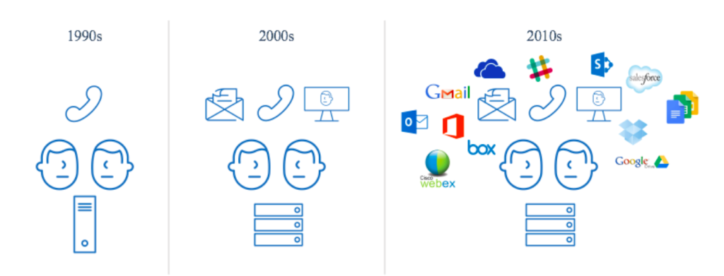 The digital workplace, like most things digital, began in the 1990s. Work was still largely tied to a physical location, but began to more strongly rely on technology. Imagine four people, sitting in a conference room, perhaps on the phone, typing and saving the meeting minutes onto a local computer that lived at the office (and still printing out paper copies).