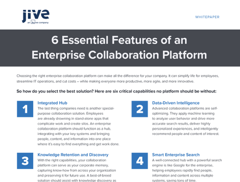 Jive is a comprehensive platform, with a wide array of capabilities that make collaboration seamless, fluid and intuitive.