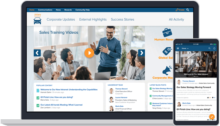 Jive collaboration software isn’t confined to collaboration. It’s also a complete interactive intranet for up-to-the-minute company communications, employee engagement, onboarding, knowledge sharing, employee support and more. It’s easy to use, too, with a captivating consumer-style desktop and mobile experience that drives high adoption and usage.
