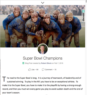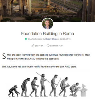 Bob: The goal of my leadership blogs is to connect with all Jive employees, inspire them through customer stories, help them appreciate their role in contributing to our business, and motivate them through personal anecdotes and ideas. At the end of the day, one of the best things I can support with my blogs is strategic alignment across Jivers everywhere.