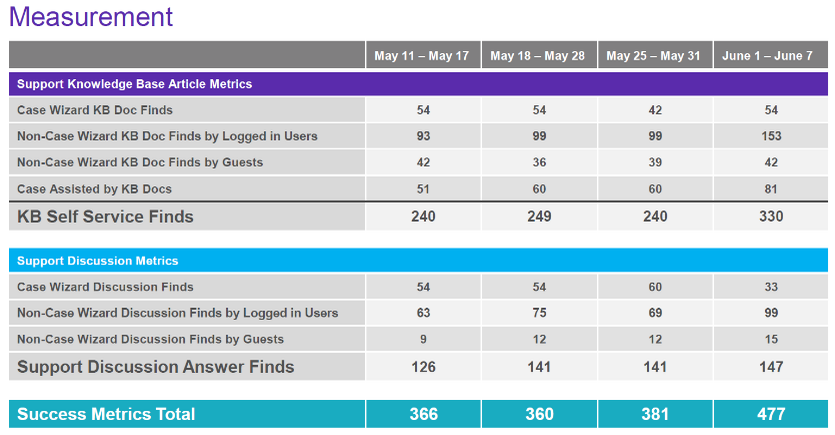 Once we established clearly understood metrics that were supported by the executive team, we quickly built a solid and repeatable process of identifying new articles, creating new articles, maintaining new articles, driving increases usage and traffic toward those articles (marketing), measuring the effectiveness of the system overall, and repeating.