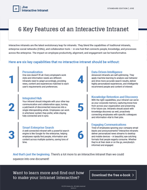 The interactive intranet is the latest evolutionary leap for intranets, blending the capabilities of many other systems – including traditional intranets, enterprise social networks (ESNs), and a wide range of other tools – in a greater-than-the-sum-of-the-parts combination. The result is a complete communication and collaboration hub: a central place for communication, planning, sharing, learning and execution.