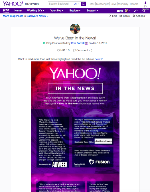 Michael: Backyard provides the “glue” to other disparate systems across Yahoo’s intranet via integrations or launching points, and has dramatically increased the amount of user-generated content on our intranet. As we moved away from traditional CMS and wiki platforms, authors were able to readily create work spaces, projects, groups, discussions and the like. This resulted in a dramatic increase in searchable content, vs. having information hidden in documents or email threads. It also increased collaboration across Yahoo, as the platform makes these interactions easy and enjoyable. Jive’s research has found that a “best in class” benchmark for active monthly users is 83%, and Yahoo exceeded that in 2015 and 2016: 85% and 88%, respectively. Another best in class benchmark from Jive is 210 for the monthly engagement index (which measures the number of user page views generated by active members in a given month). After Jive was officially launched as Yahoo’s new Backyard (replacing the legacy CMS), we also surpassed this number, averaging 344 for 2016.