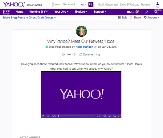 Michael: Jive was initially adopted by our technical community, which makes up roughly half of Yahoo. As we migrated Backyard from a legacy CMS to Jive, it was heavily adopted by all our Yahoos: the People Team (HR), Sales, Marketing, Real Estate & Workplace, and of course Internal Communications, which drives a majority of the content on Backyard’s home page. Yahoo’s employee resource groups and other social and cultural groups are also active Jive users.