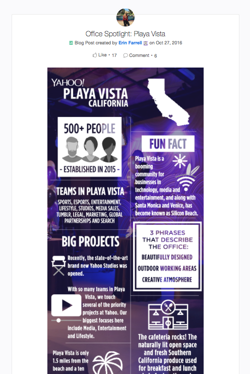 Carolyn: All of Yahoo’s thousands of global employees across our offices in Hong Kong, Toronto, D.C., New York, etc., rely on Jive for accurate information about what’s going on across the company. In addition to featuring “Yahoo in the news” updates, Backyard also helps to engage dispersed employees through a series of regular features with compelling visuals and infographics. For example, employees enjoy several series we post with quick, fun snippets, such as “get to know” regarding interesting leaders, “why yahoo?” on people who recently joined the company, “office spotlights” about various locations, and “five things” on each new product update.