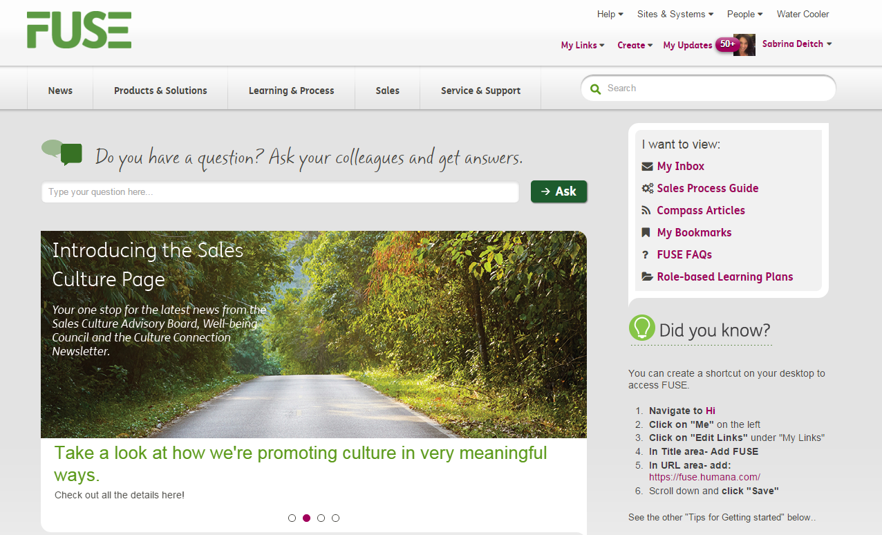 Sabrina: Jive for Humana’s employer group division is a sales enablement tool we have named “FUSE,” which harnesses the power of community and connects representatives, helping to identify subject matter experts and enable two-way communications between Sales and supporting business areas.
