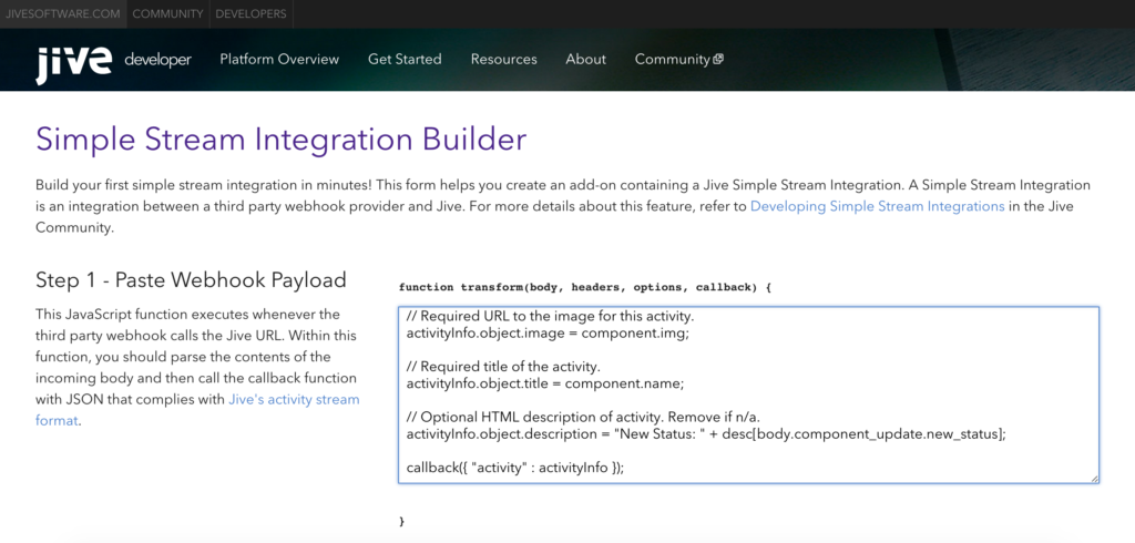 This is step-by-step tutorial on how to use the Simple Stream Integration Builder to create a simple activity stream integration with StatusPage.io. This will enable you to get a one-way webhook-style activity stream from StatusPage.io, to a Jive group, without middleware in around 10 minutes! This tool is a first in a series of episodes we’ll be releasing that will enable you to save time developing for your Jive instance.